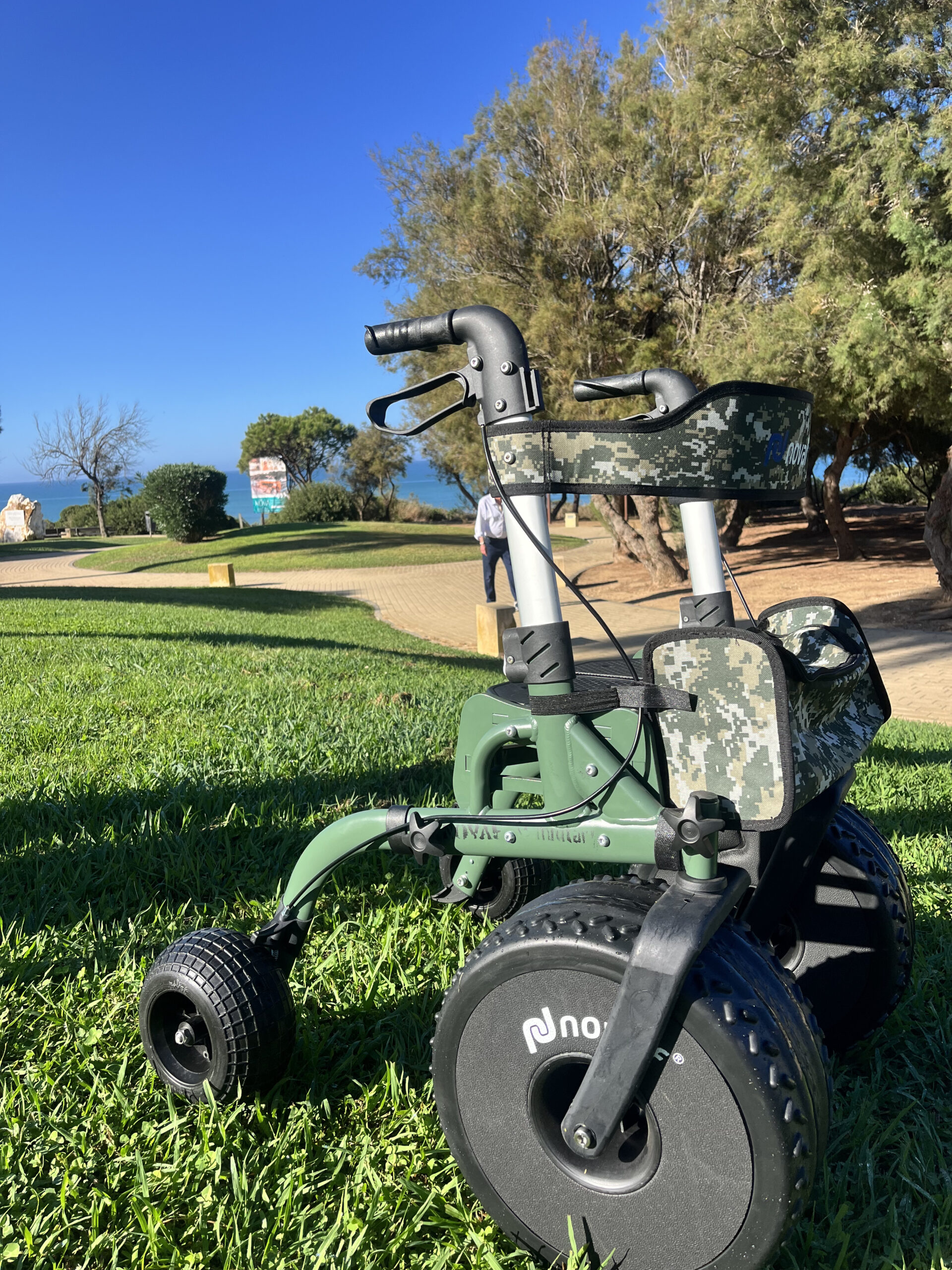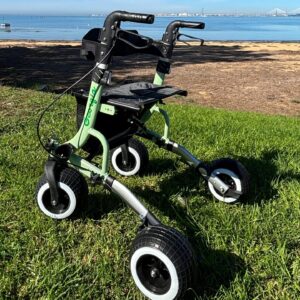 Mejore sus aventuras al aire libre con el Andador para adultos “MILITARY” VERDE. Fabricado con ruedas todoterreno duraderas, este andador ligero y portátil se desplaza sin esfuerzo por playas de arena, senderos con césped y superficies irregulares.