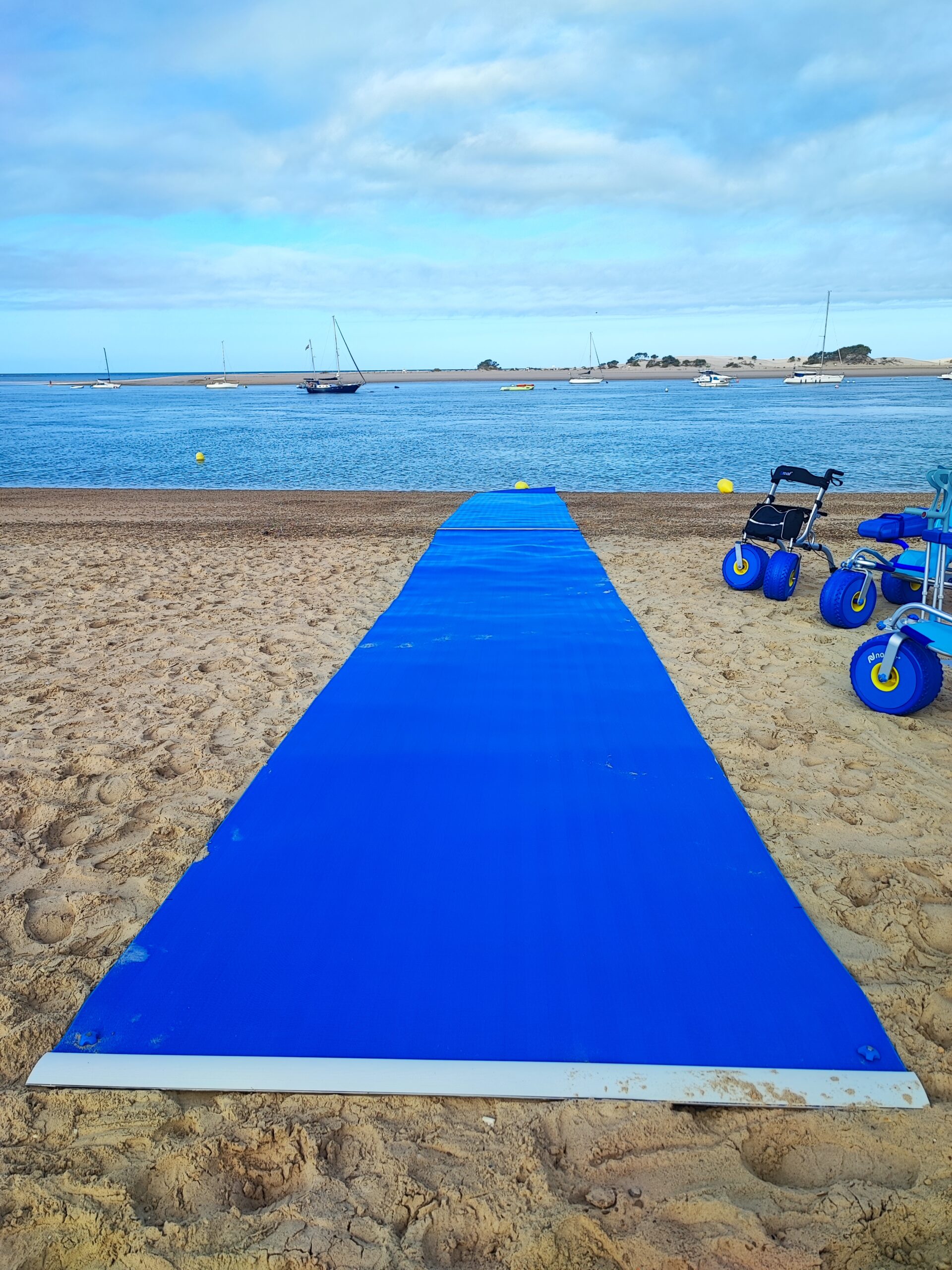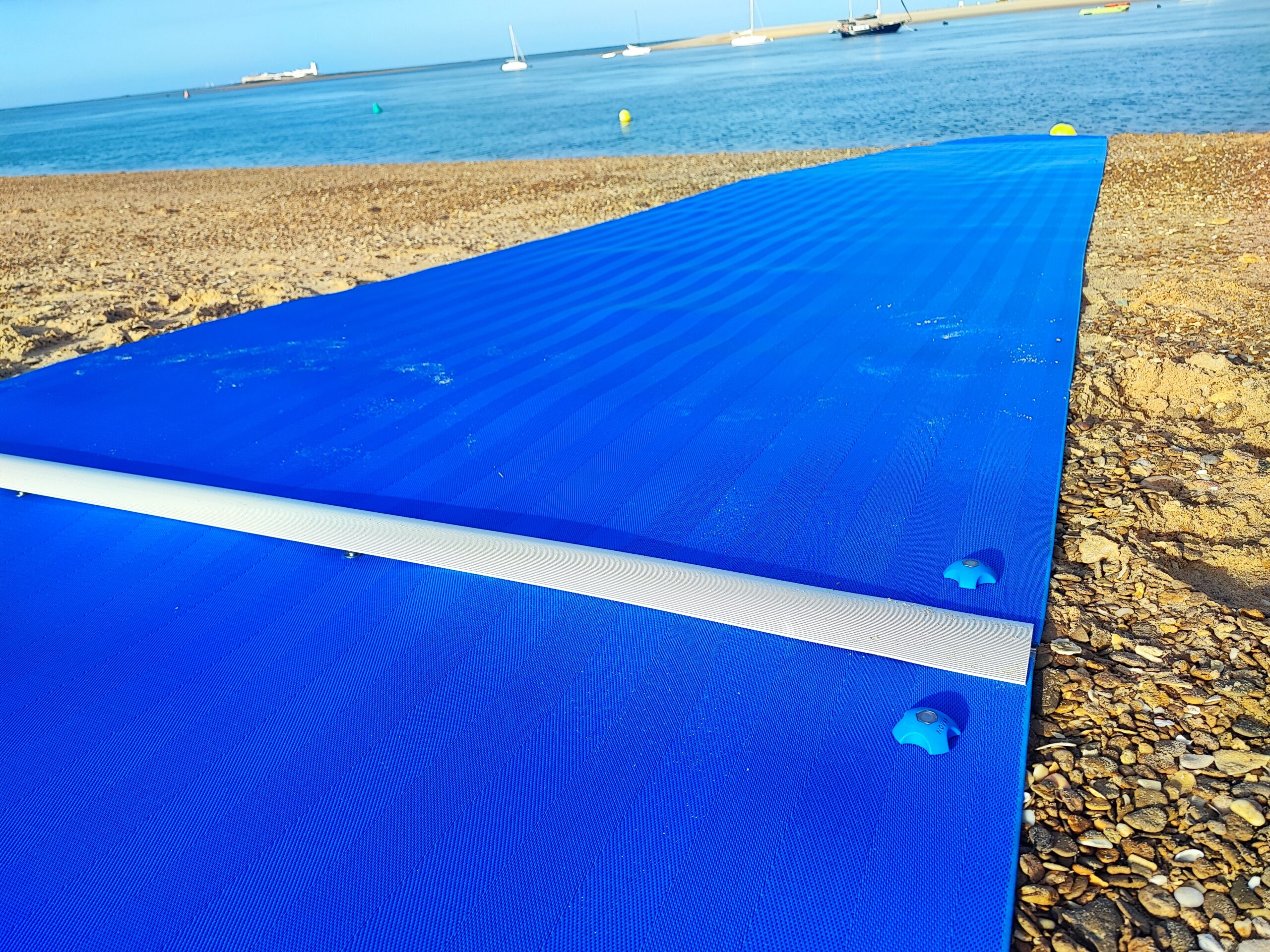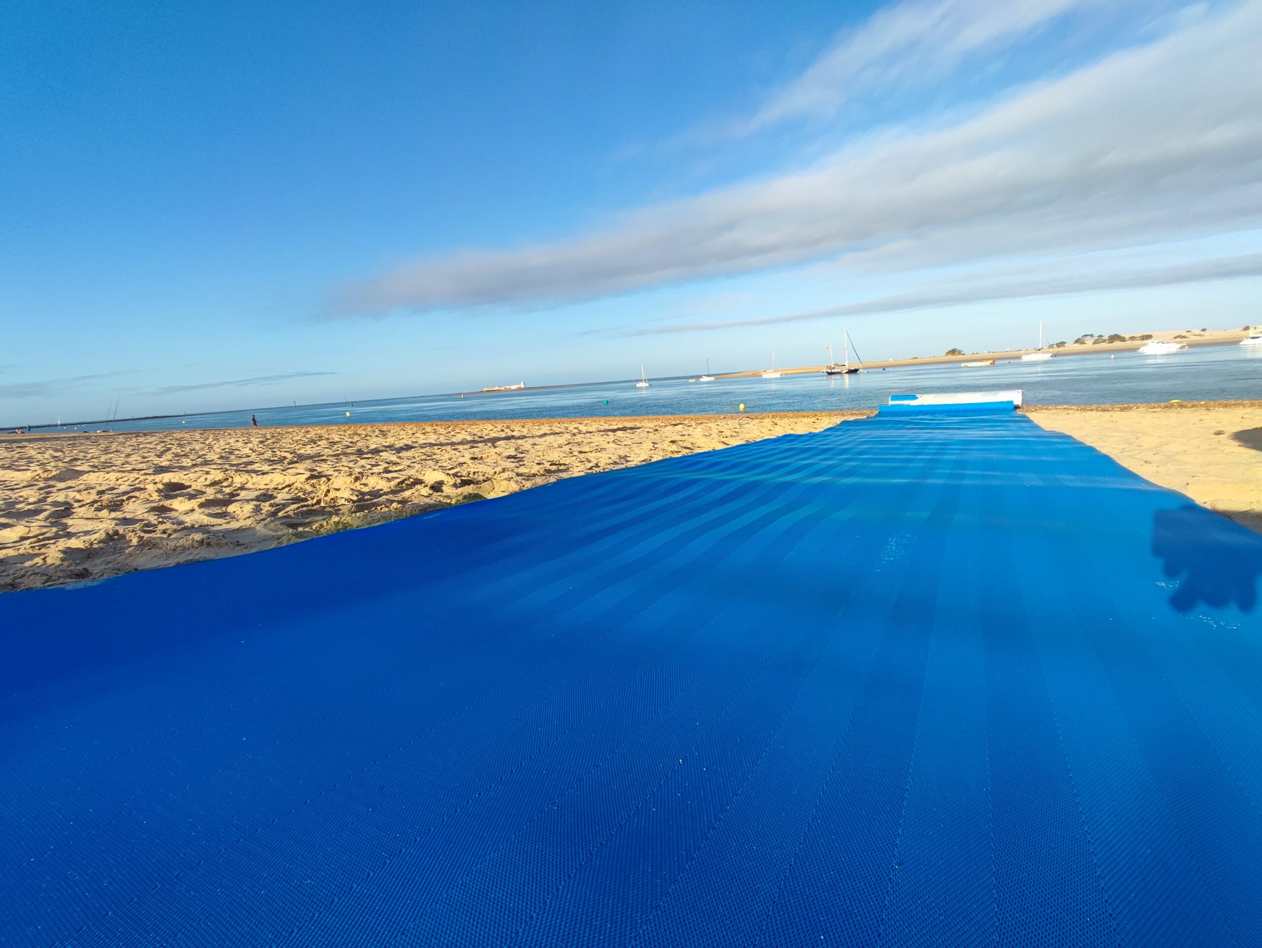 Diseñada para la accesibilidad de P.M.R. en las playas, carritos de bebes, bicicletas, etc.. y con una estructura flexible, permeable, sin clavos y sin astillas para la seguridad de los usuarios.